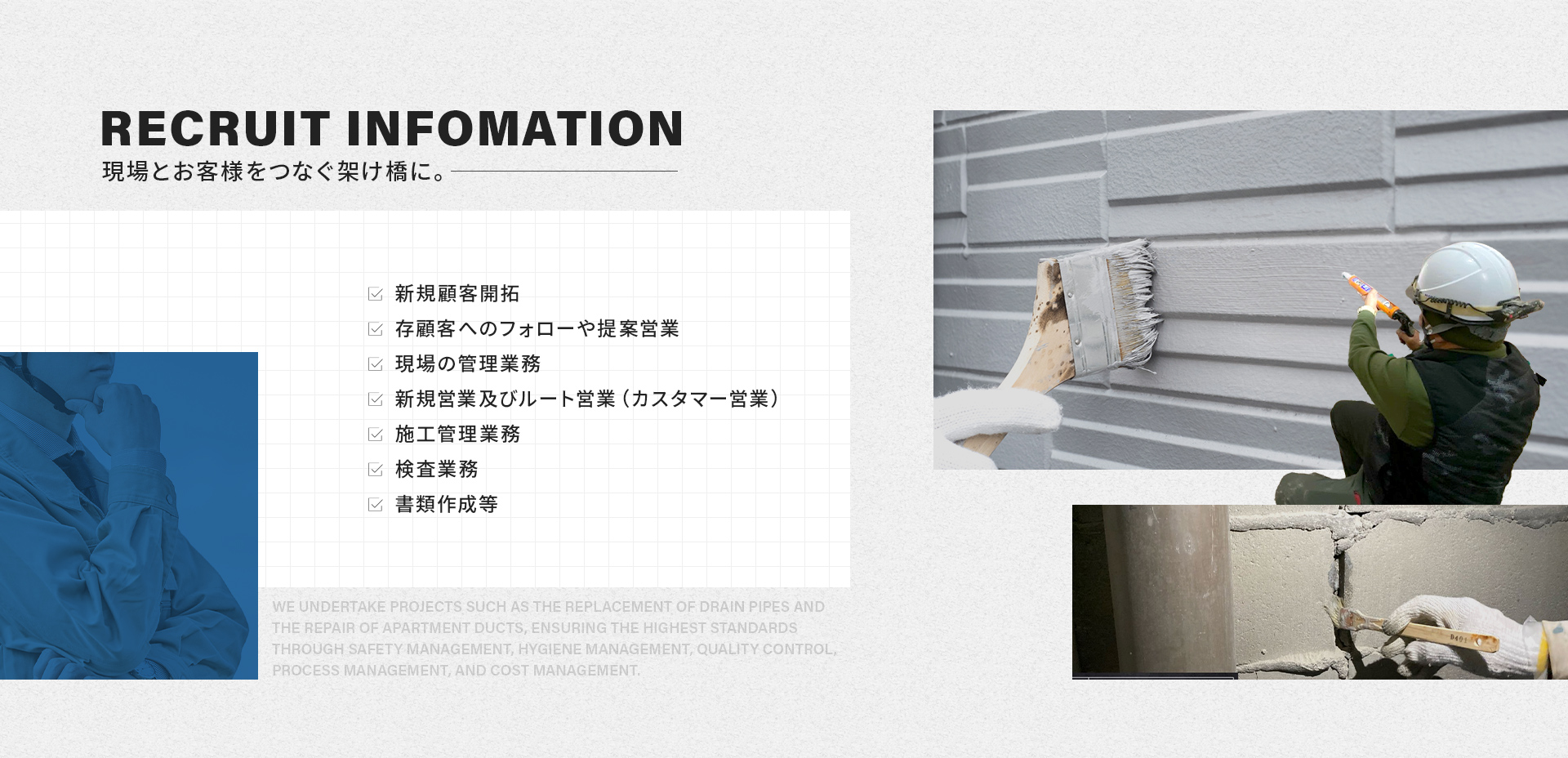 排水管の交換工事やマンションのダクト補修、カバー工法による施工、福祉施設での手すり取り付けや、各種リフォームなど、幅広い分野を担当します。安全管理、衛生管理、品質管理、工程管理、コスト管理を徹底し、常に安全と品質を最優先に考え、円滑に工事を進めることが求められます。全と品質は最優先で、事故やトラブルを防ぎ、確実に高品質な工事を提供することを心がけ、状況に応じて柔軟に対応し、お客様のご要望に合った工事を行います。