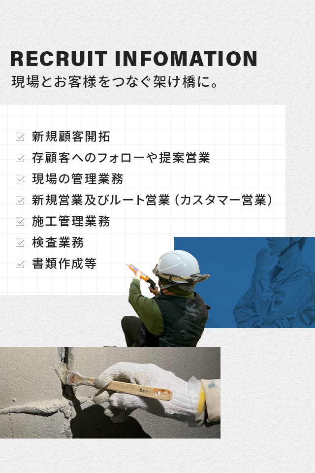 新規顧客の開拓と既存顧客へのフォローを中心に、お客様一人ひとりに寄り添い、ご要望に応じて、最適なサービスや工事の提案を行います。お客様との信頼関係を築きながら、必要に応じて追加工事の提案やアフターフォローを行います。営業活動は、個々の強みを活かせる柔軟な環境で行われており、先輩との同行を通じて学びながら成長できます。お客様のご要望をしっかりと把握し、最適な提案を行うことで、高い顧客満足度を実現することができます。